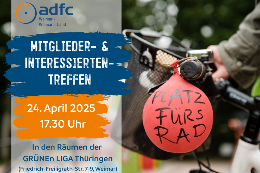 Nach einer Pause nimmt der Allgemeine Deutsche Fahrrad-Club e. V. Kreisverband Weimar - Weimarer Land seine Arbeit wieder auf. Das Auftakttreffen findet am Donnerstag, den 24. April 2025, 17.30 Uhr, in den Räumlichkeiten der GRÜNEn LIGA Thüringen (Ferdinand-Freiligrath-Str. 9) in Weimar statt. Hierzu sind alle Mitglieder des Verbands, aber auch Interessierte herzlich eingeladen!