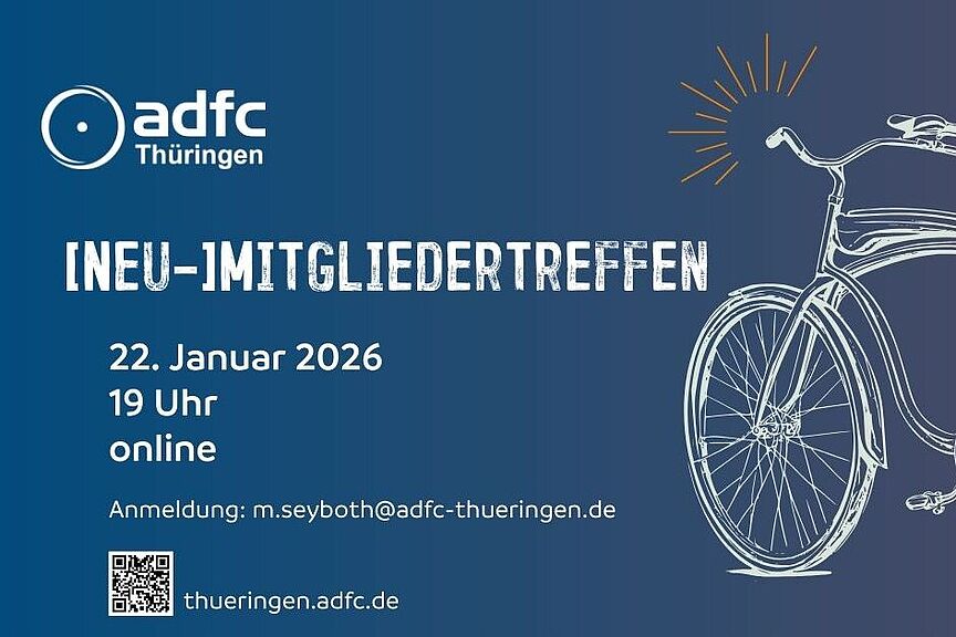 Wer neu im ADFC ist, möchte vielleicht gern auch mal die „Gesichter hinter dem Verein“ kennenlernen, sich über Mitmachmöglichkeiten informieren oder Fragen und Anregungen loswerden. Hierfür bietet der ADFC Thüringen mit dem nächsten (Neu-) Mitgliedertreffen die Möglichkeit. Es findet am Donnerstag, 22. Januar 2026, 19 Uhr online statt. Für die Zusendung des Einwahllinks melden Sie sich bitte über m.seyboth[at]adfc-thueringen.de bei uns. Natürlich sind auch nicht-neue ADFC-Mitglieder herzlich willkommen und ebenso Menschen, die (noch) nicht Mitglied sind, sich aber für die ADFC-Arbeit interessieren.
